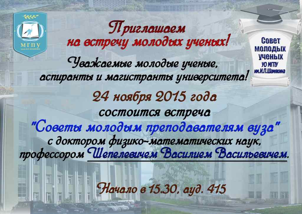 24 ноября 2015 года по инициативе совета молодых ученых УО МГПУ им. И.П.Шамякина состоялась встреча молодых преподавателей, аспирантов и магистрантов университета с доктором физико-математических наук, профессором Василием Васильевичем Шепелевичем.