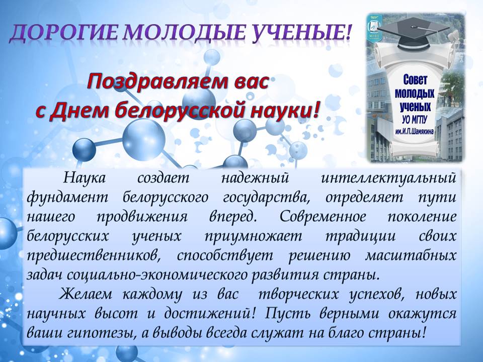 Наука создает надежный интеллектуальный фундамент белорусского государства, определяет пути нашего продвижения вперед. Современное поколение белорусских ученых приумножает традиции своих предшественников, способствует решению масштабных задач социально-экономического развития страны.